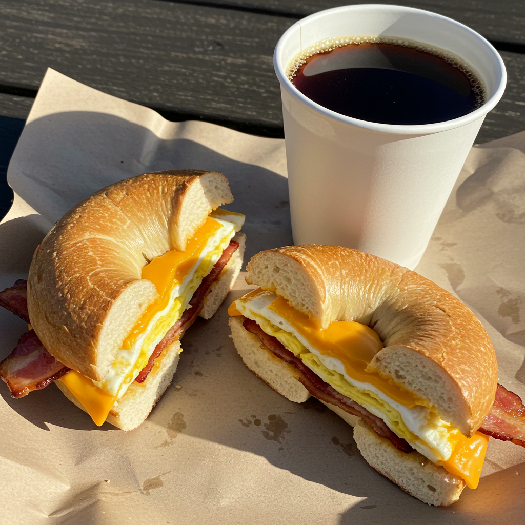 Start your day right with a warm, freshly toasted bacon, egg, and cheese sandwich — perfectly balanced with crispy bacon, fluffy eggs, and melted cheese — paired with a smooth, freshly brewed coffee for the ultimate breakfast combo.